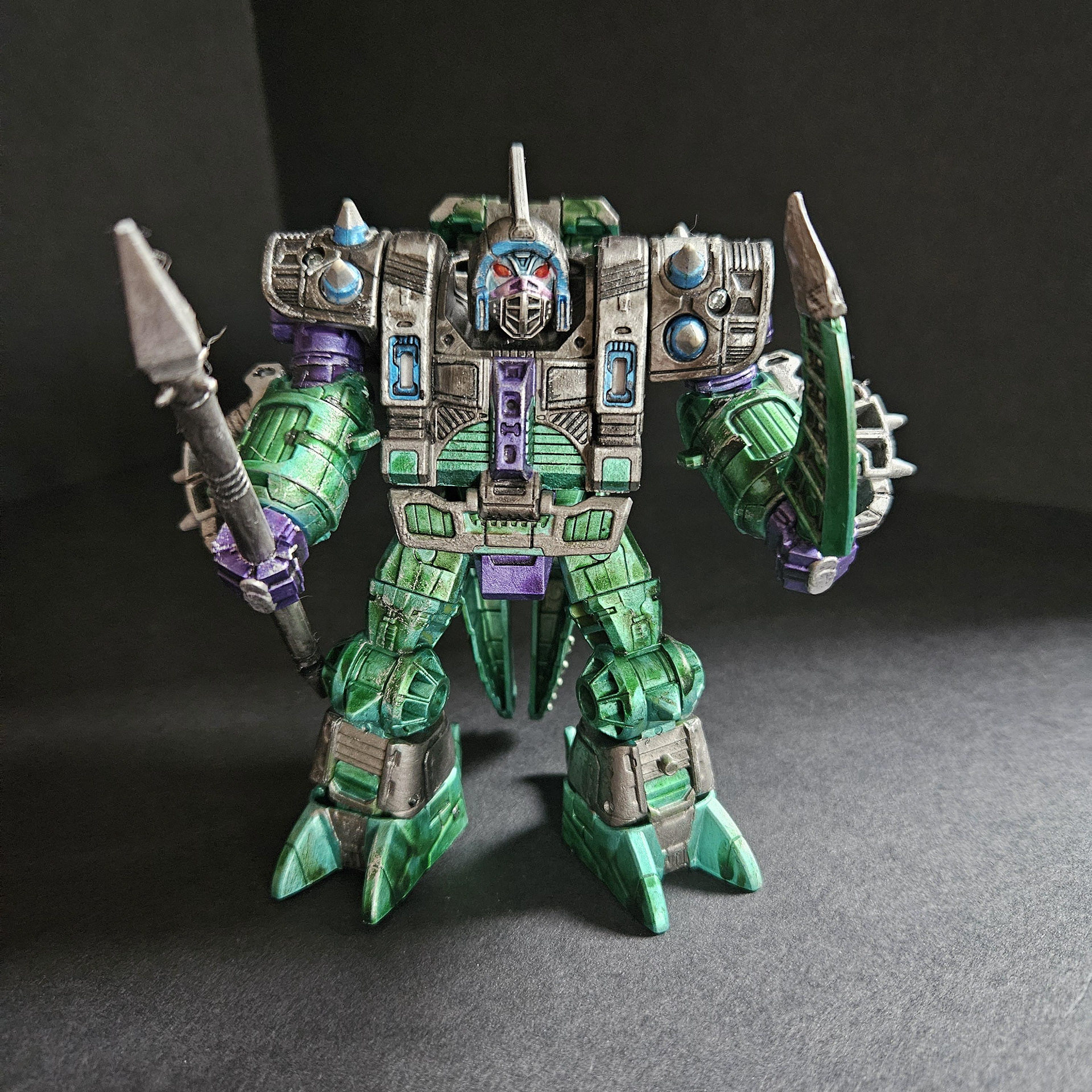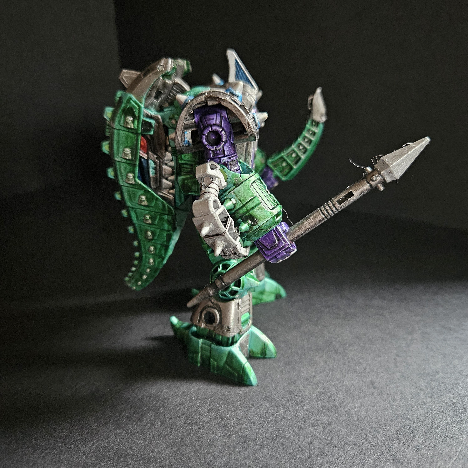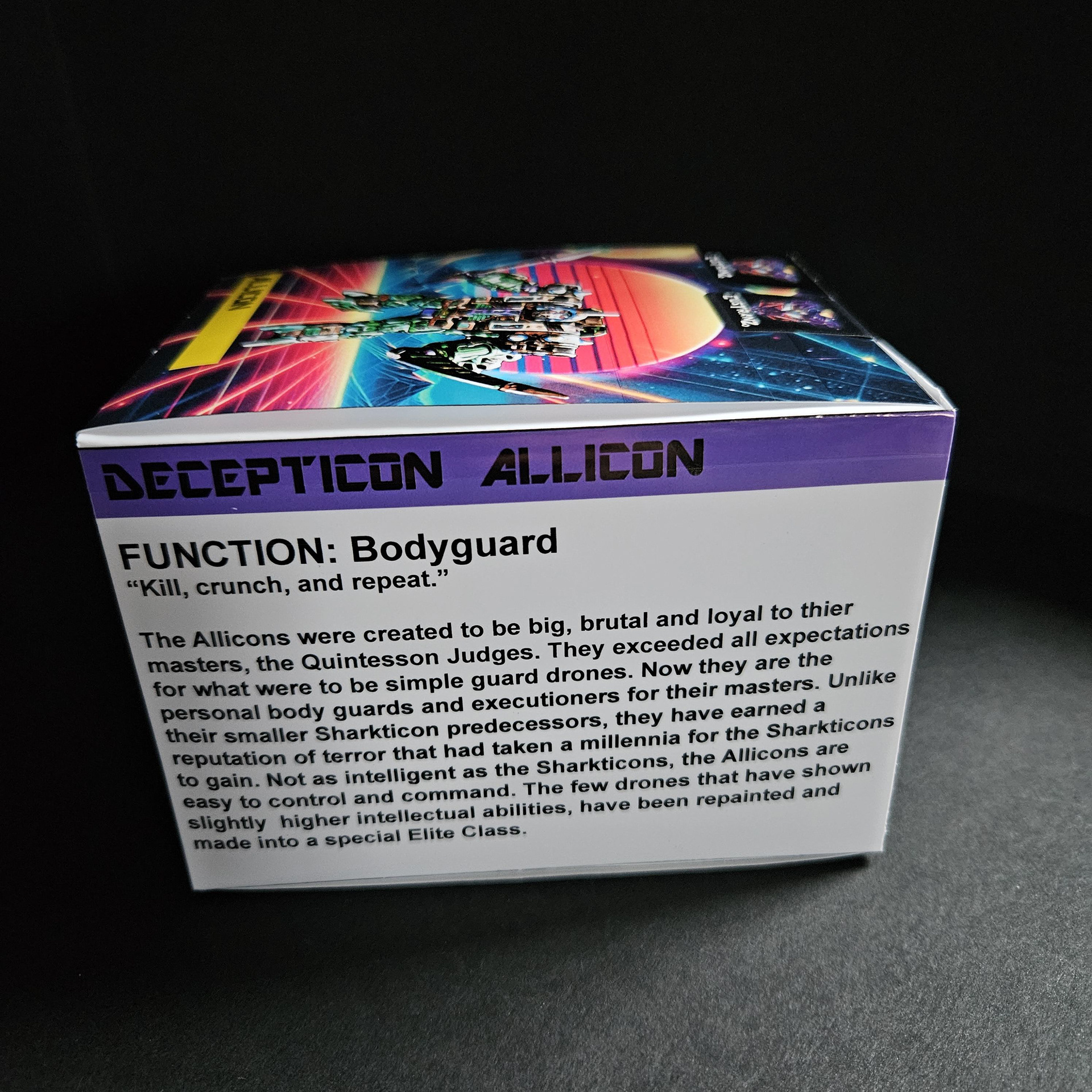 masters, the Quintesson Judges. They exceeded all expectations for what were to be simple guard drones. Now they are the personal body guards and executioners for their masters. Unlike their smaller Sharkticon predecessors, they have earned a reputation of terror that had taken a millennia for the Sharkticons to gain. Not as intelligent as the Sharkticons, the Allicons are easy to control and command. The few drones that have shown slightly higher intellectual abilities, have been repainted and made into a special Elite Class.