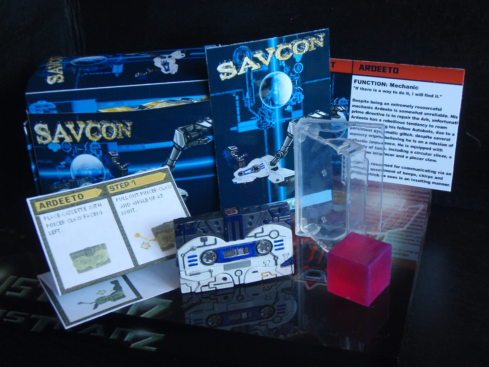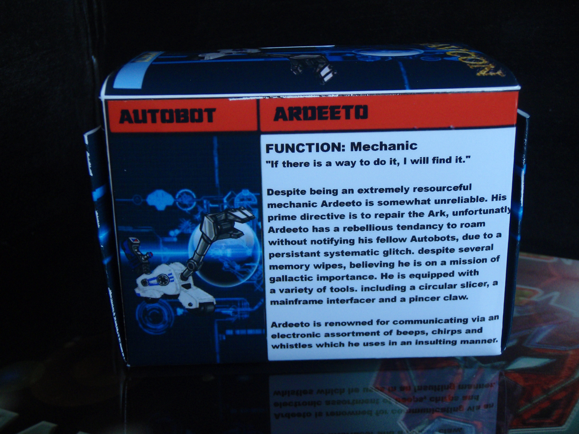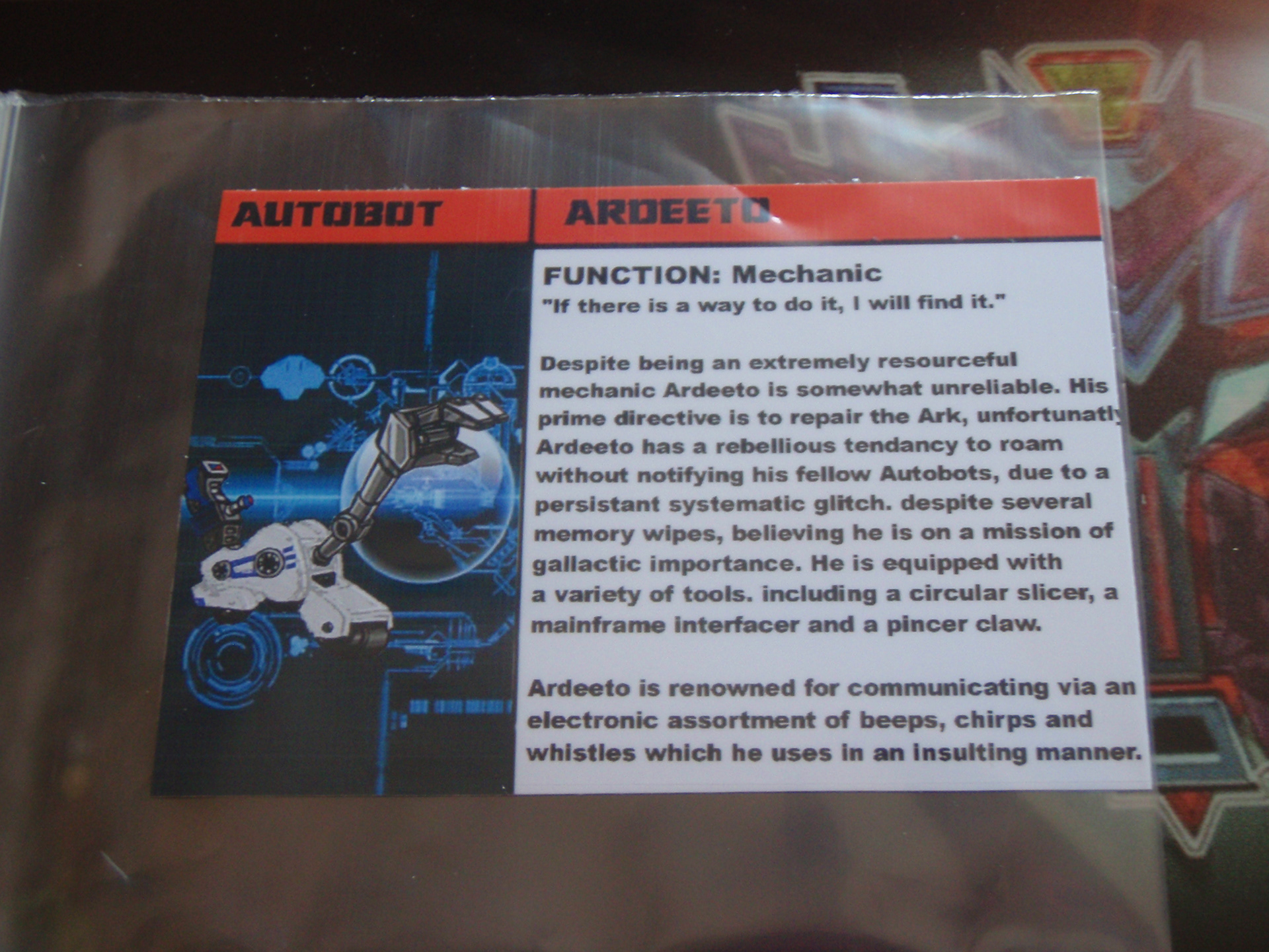 Despite being an extremely resourceful mechanic Ardeeto is somewhat unreliable. His prime directive is to repair the Ark, unfortunately Ardeeto has a rebellious tendency to roam without notifying his fellow Autobots, due to a persistent systematic glitch. Despite several memory wipes, believing he is on a mission of galactic importance. He is equipped with a variety of tools, including a circular slicer, a mainframe interfacer and a pincer claw.