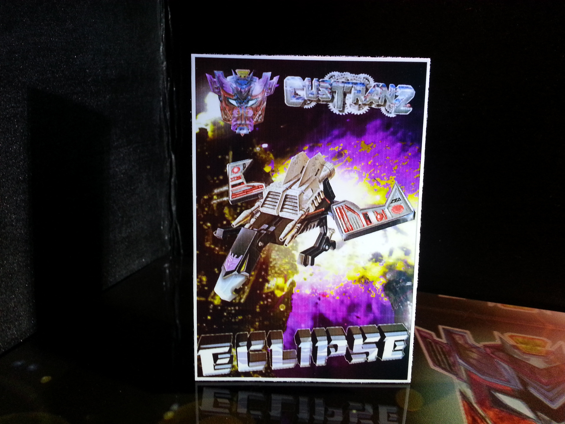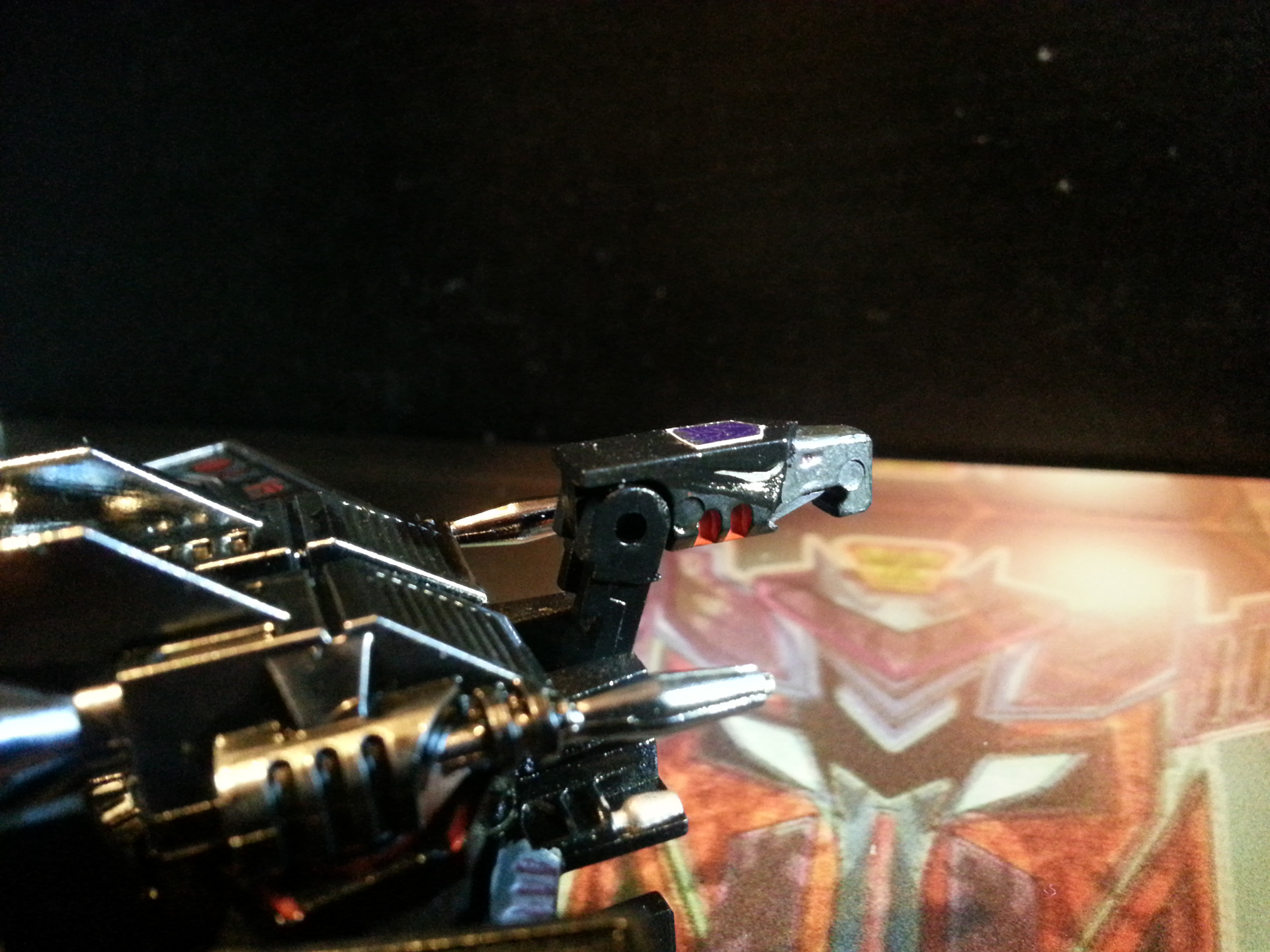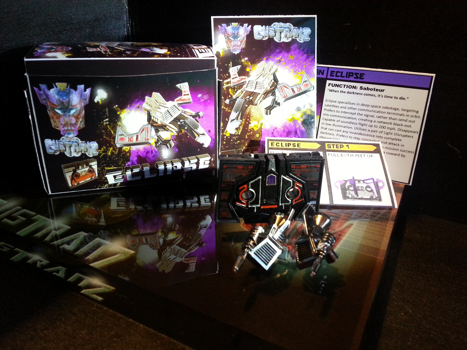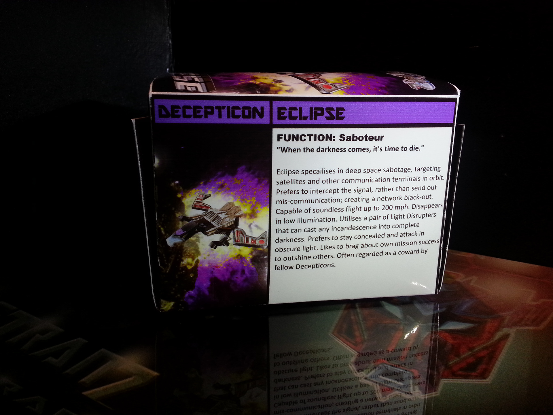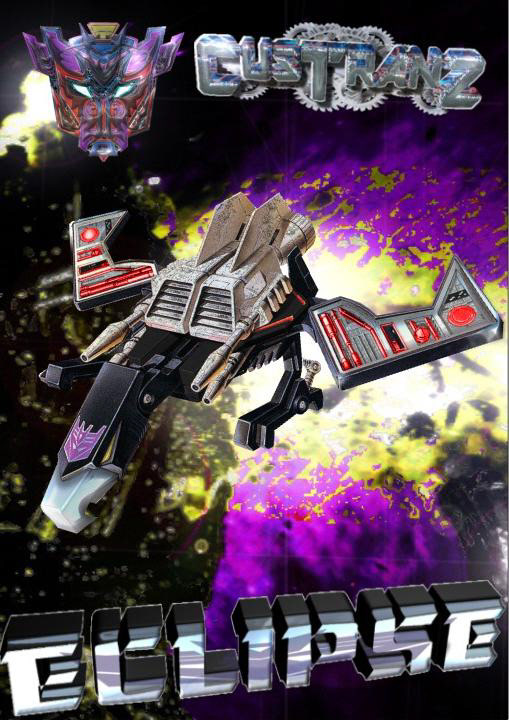 Eclipse specialises in deep space sabotage, targeting satellites and other communication terminals in orbit. Prefers to intercept the signal rather than send out miss-communication; creating a network blackout. Capable of soundless flight of up to 200mph. Disappears in low illumination. Utilises a pair of Light Disrupters that can cast any incandescence into complete darkness. Prefers to stay concealed and attack in obscure light. Likes to brag about own mission success to outshine others. Often regarded as a coward by fellow Decepticons.
