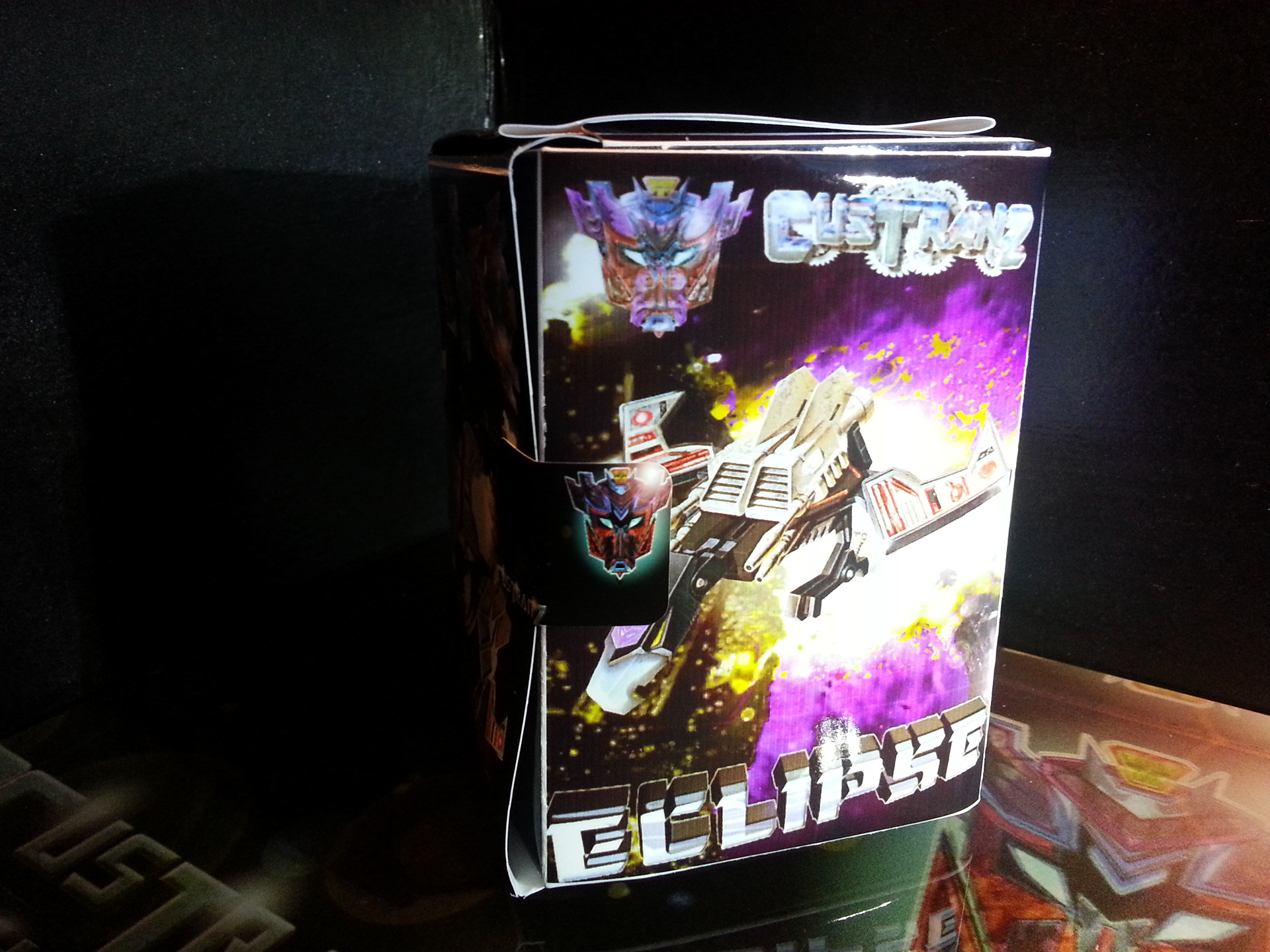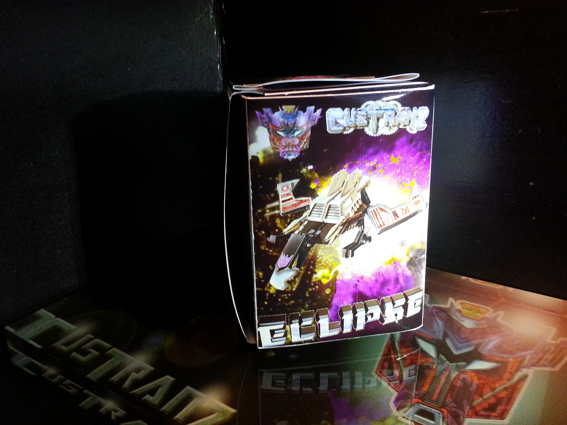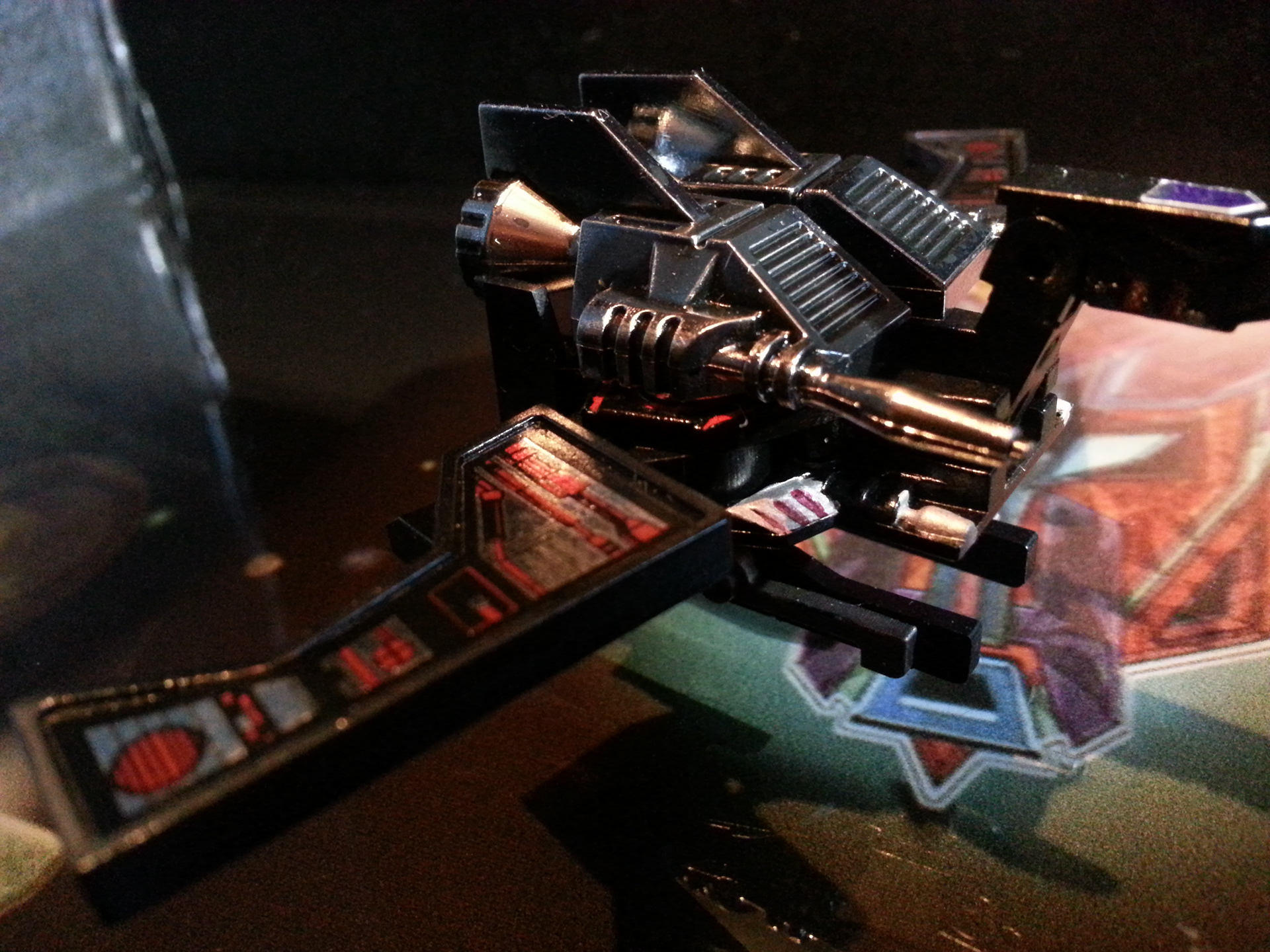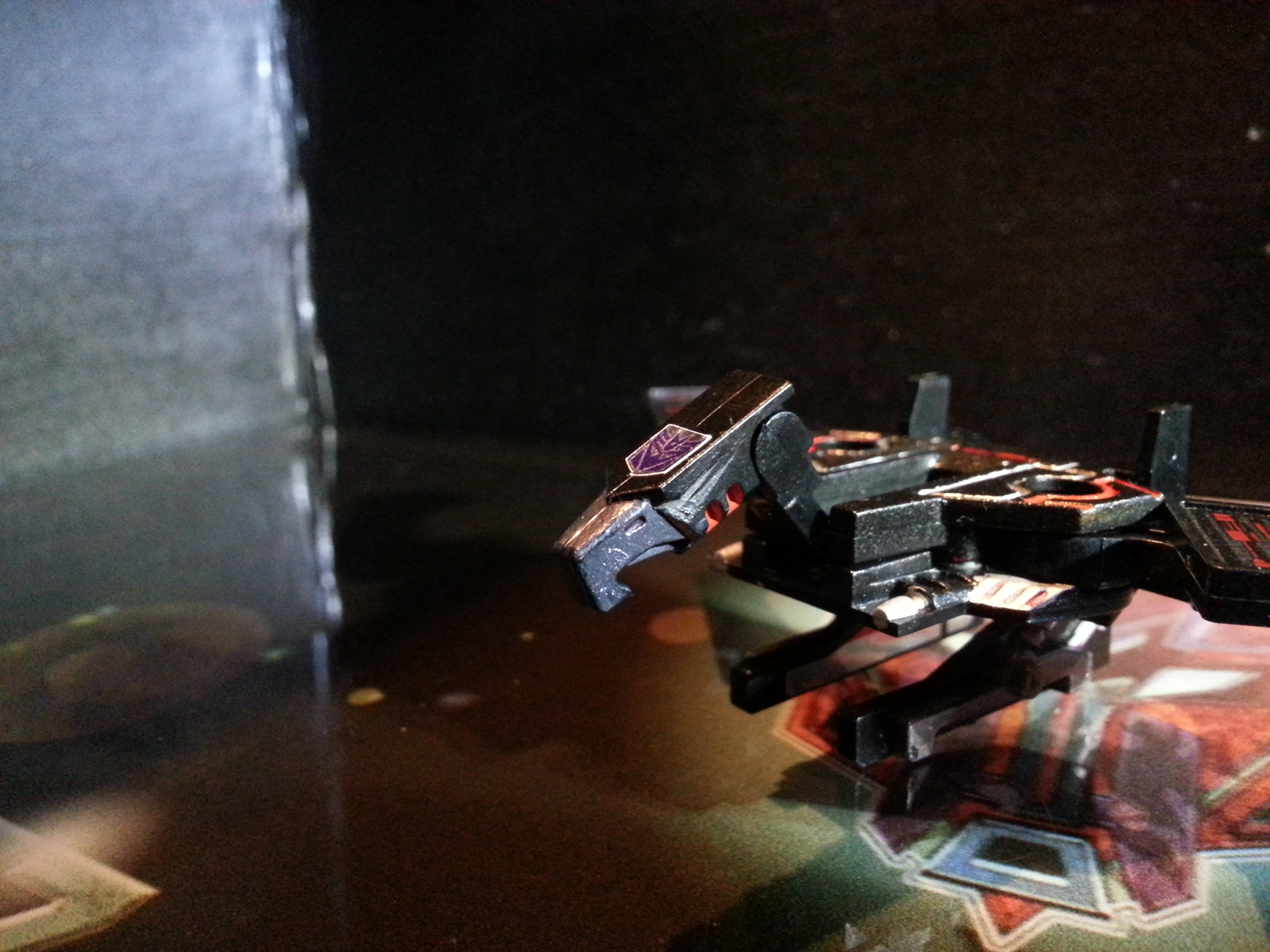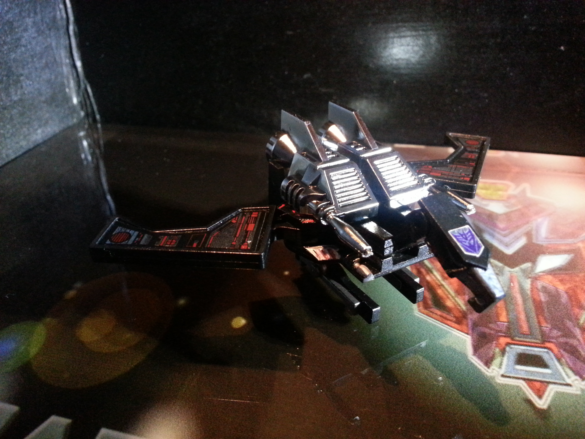 Eclipse specialises in deep space sabotage, targeting satellites and other communication terminals in orbit. Prefers to intercept the signal rather than send out miss-communication; creating a network blackout. Capable of soundless flight of up to 200mph. Disappears in low illumination. Utilises a pair of Light Disrupters that can cast any incandescence into complete darkness. Prefers to stay concealed and attack in obscure light. Likes to brag about own mission success to outshine others. Often regarded as a coward by fellow Decepticons.