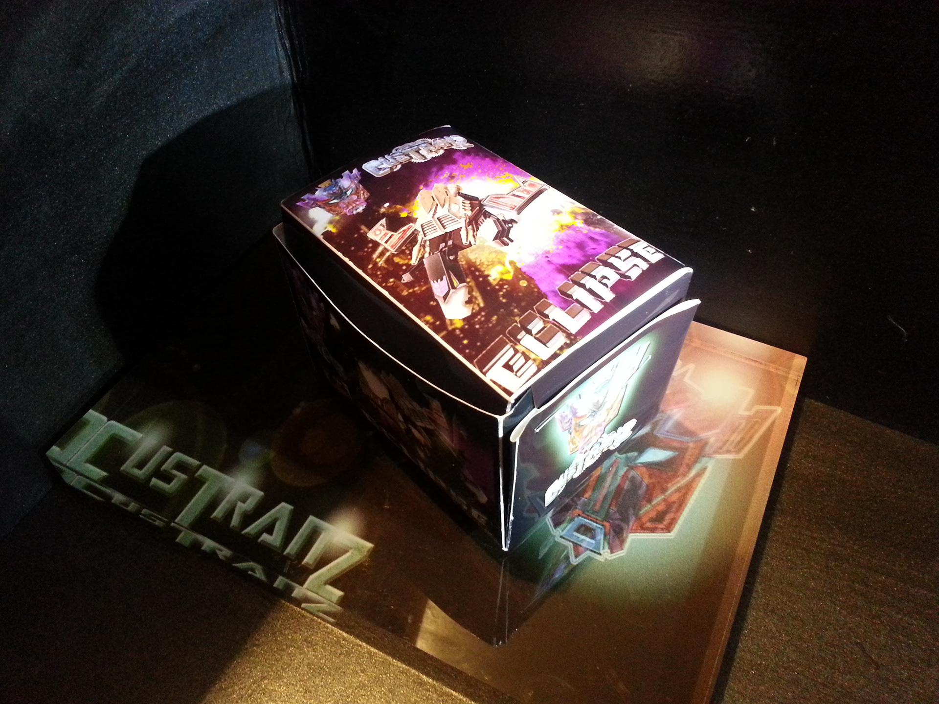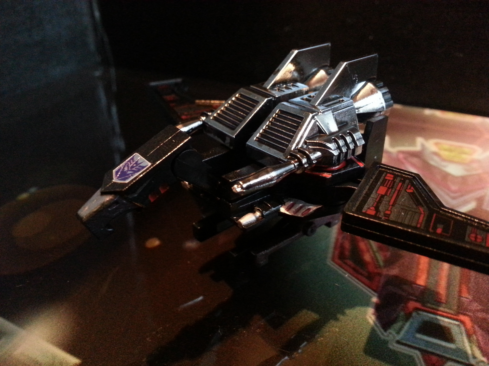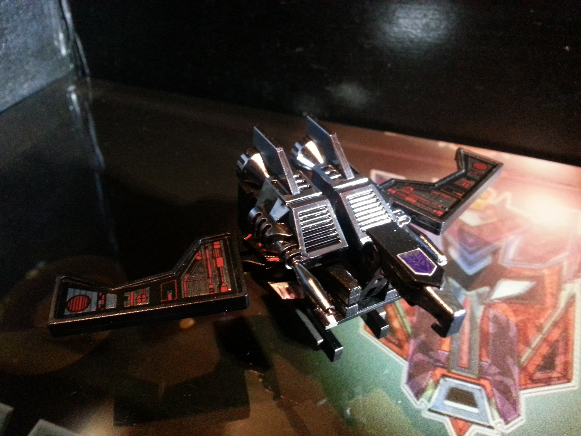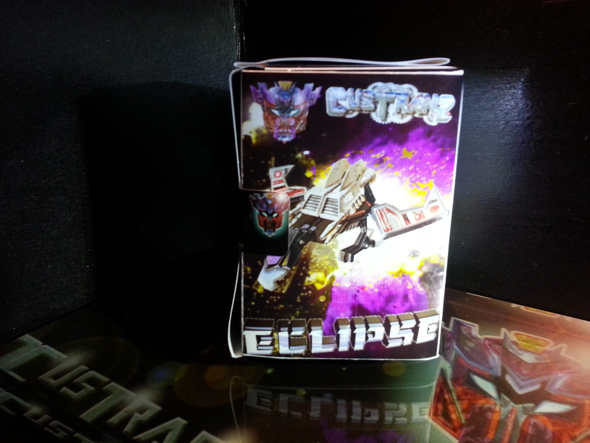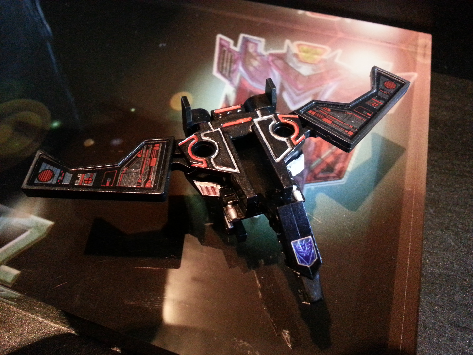 Eclipse specialises in deep space sabotage, targeting satellites and other communication terminals in orbit. Prefers to intercept the signal rather than send out miss-communication; creating a network blackout. Capable of soundless flight of up to 200mph. Disappears in low illumination. Utilises a pair of Light Disrupters that can cast any incandescence into complete darkness. Prefers to stay concealed and attack in obscure light. Likes to brag about own mission success to outshine others. Often regarded as a coward by fellow Decepticons.