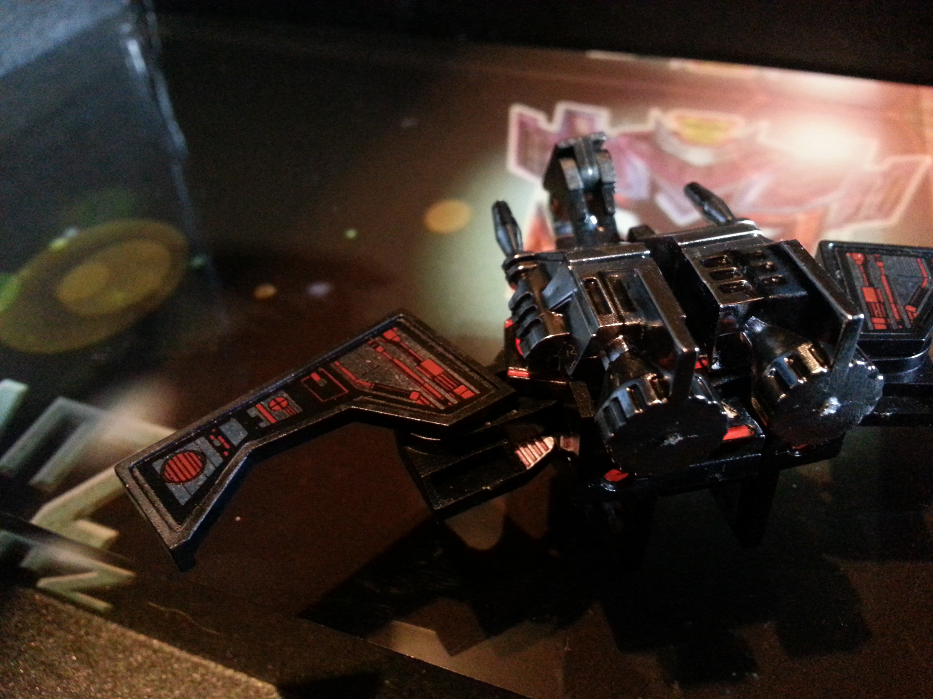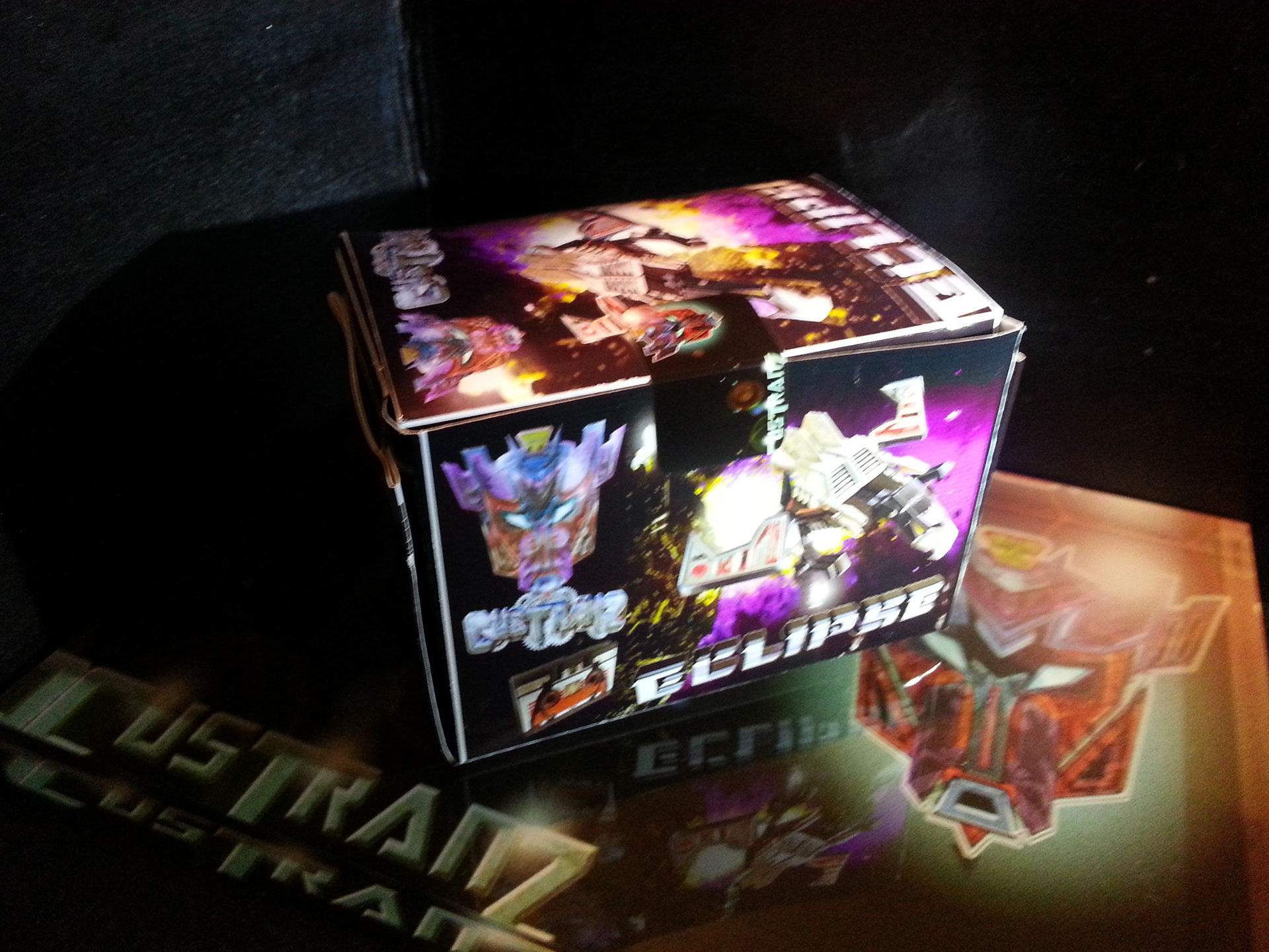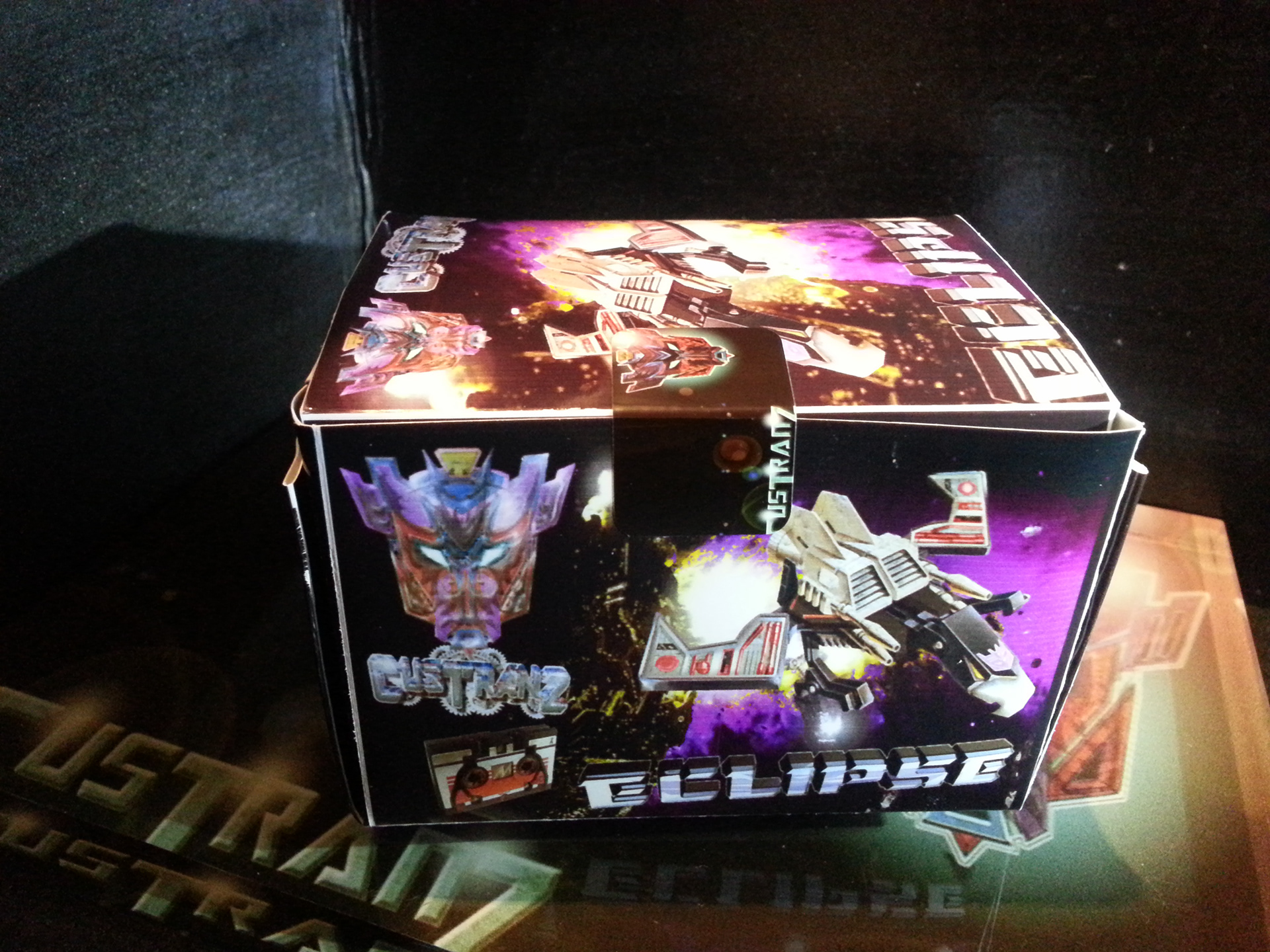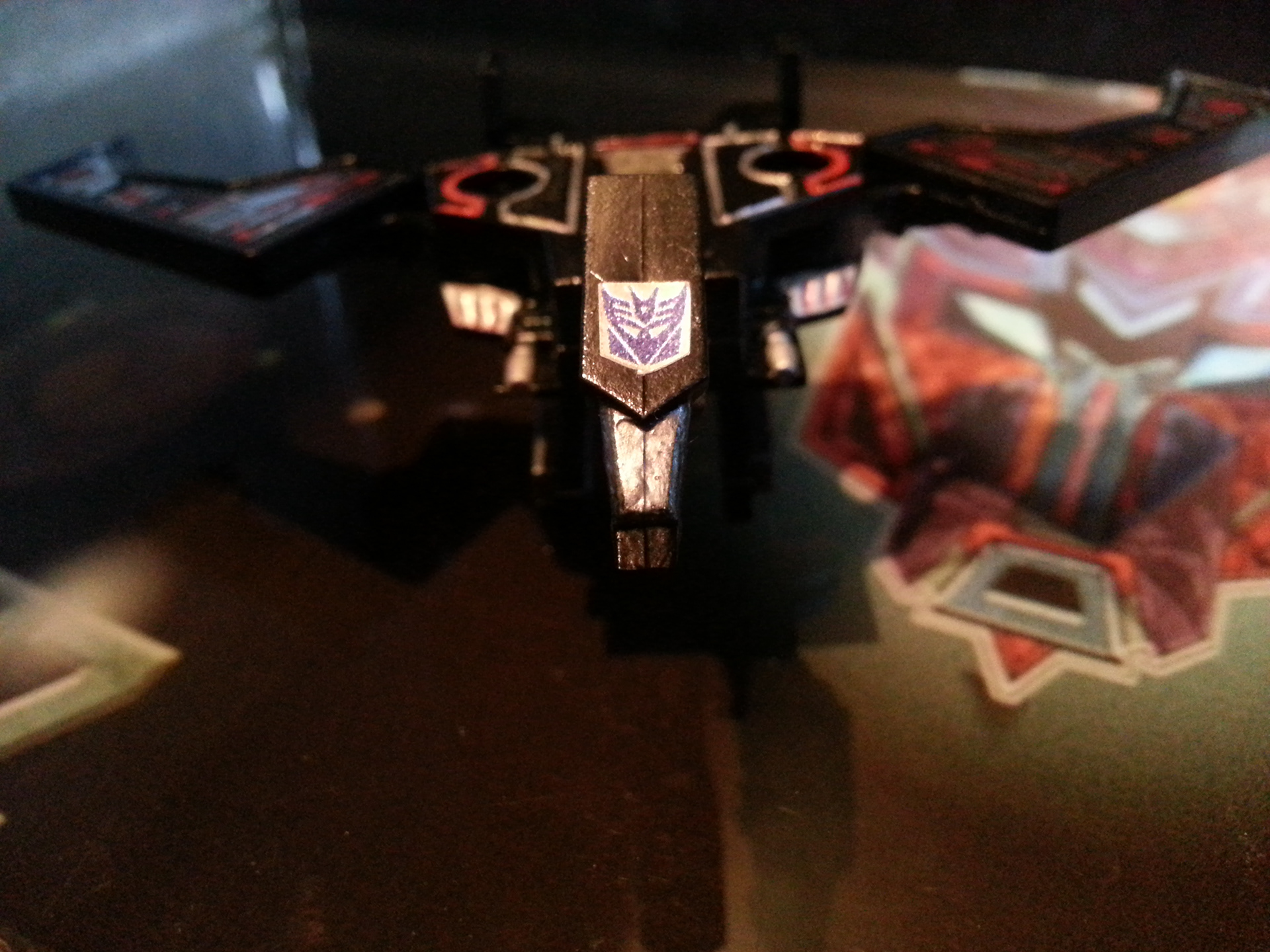 Eclipse specialises in deep space sabotage, targeting satellites and other communication terminals in orbit. Prefers to intercept the signal rather than send out miss-communication; creating a network blackout. Capable of soundless flight of up to 200mph. Disappears in low illumination. Utilises a pair of Light Disrupters that can cast any incandescence into complete darkness. Prefers to stay concealed and attack in obscure light. Likes to brag about own mission success to outshine others. Often regarded as a coward by fellow Decepticons.